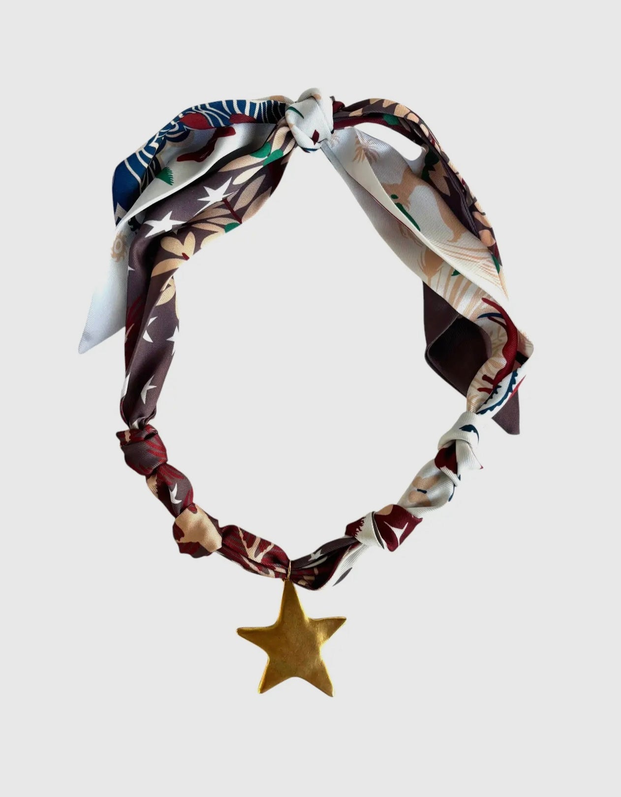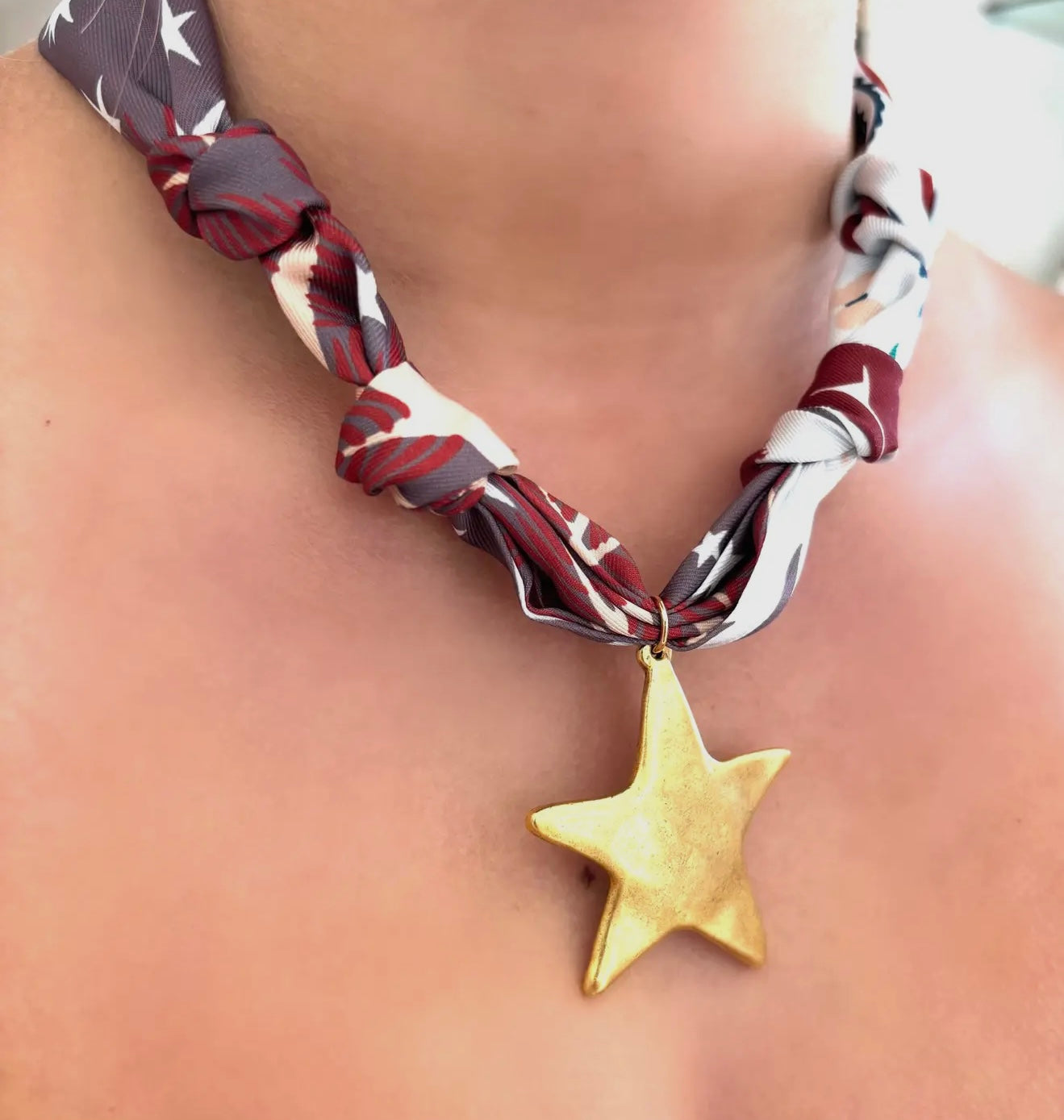 • Bold statement necklace with colorful patterned silk scarf and gold heart pendant