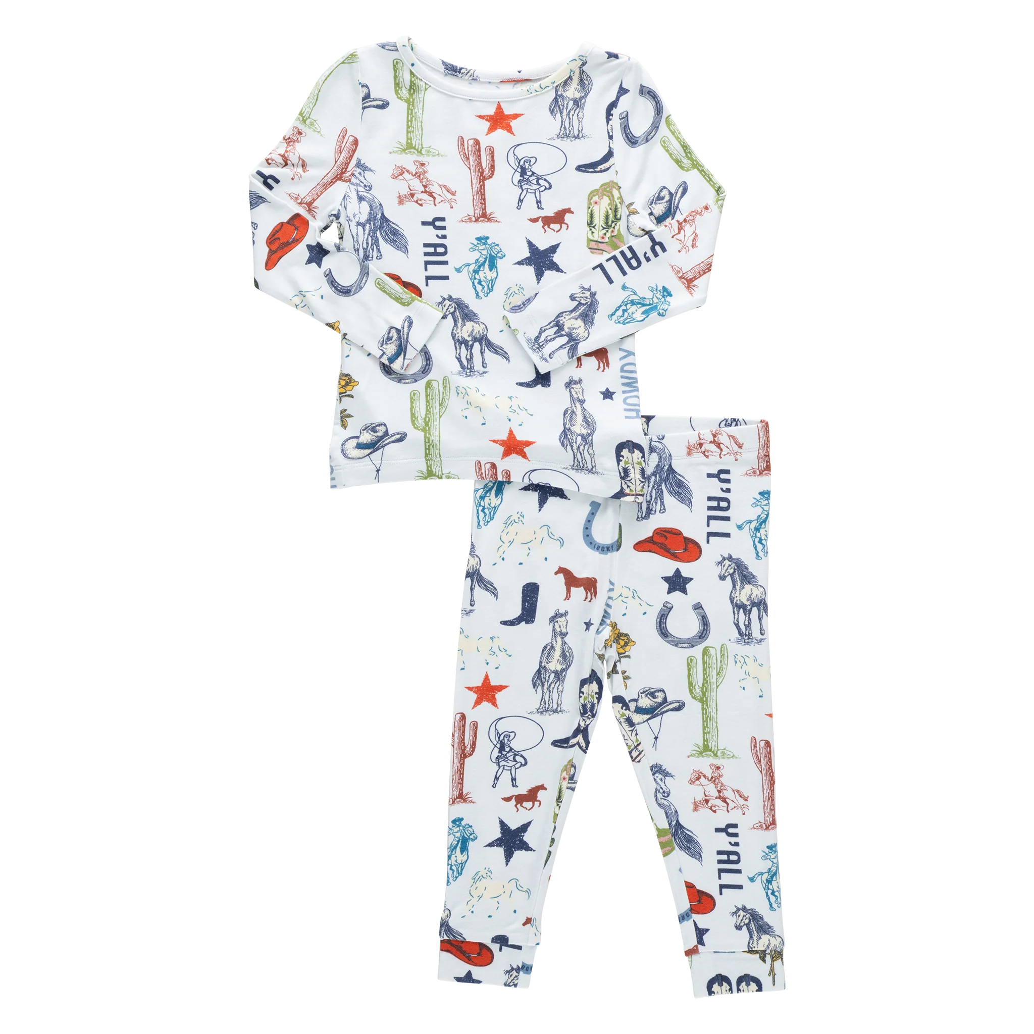 Y’all ready for bedtime? Our Kids Bamboo PJ Set rides into dreamland with our Western Dreams print, packed with playful cowboy-inspired details. This comfy two-piece set includes a long sleeve top and elastic waist pant, ideal for bedtime stories and morning cartoons. Crafted from bamboo fabric that’s unbelievably soft and breathable, these PJs keep littles comfy year-round.