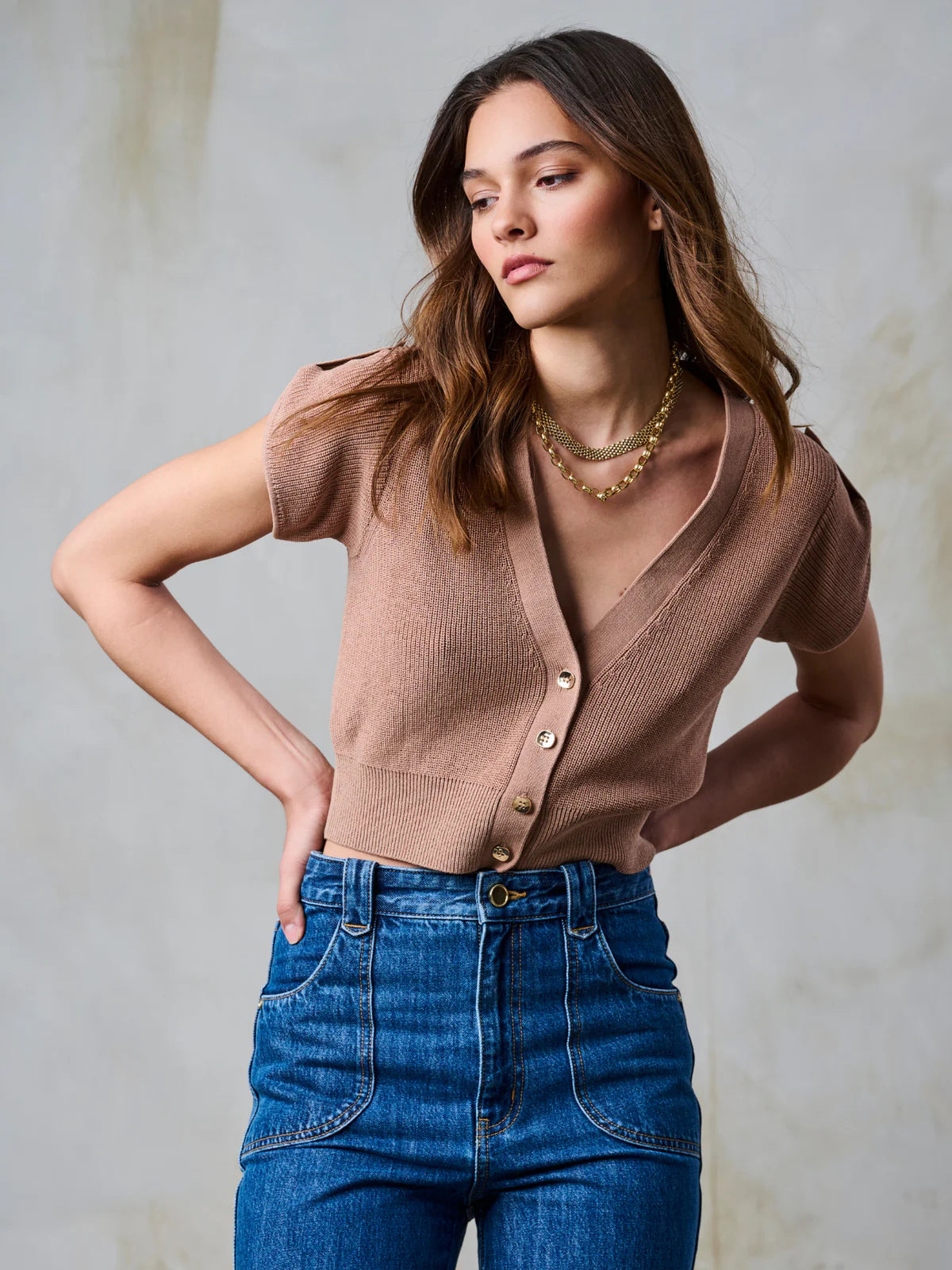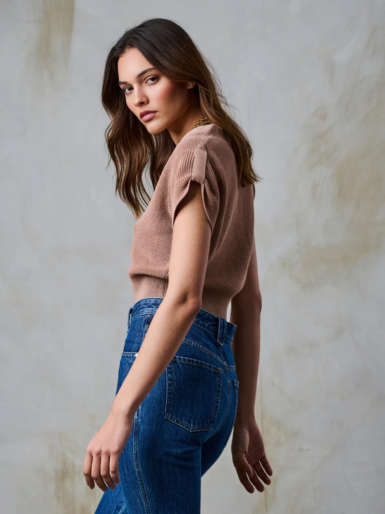 Soft structure with a feminine edge. The Lina Top is a short sleeve sweater with a flattering V neckline, subtle gathers at the sleeves, and delicate buttons down the front. Easy to  layer, or wear on its own—this one does it all.