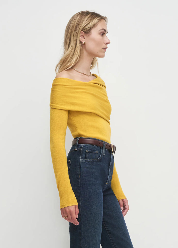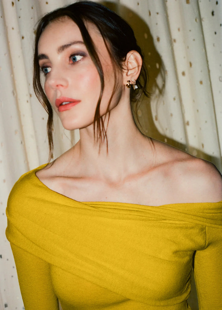 Consider yourself charmed. Our sweater top in 100% merino wool has a twisted off-the-shoulder detail, long sleeves, and a close fit that hugs in all the right places. Soft, cozy, and instantly a favorite