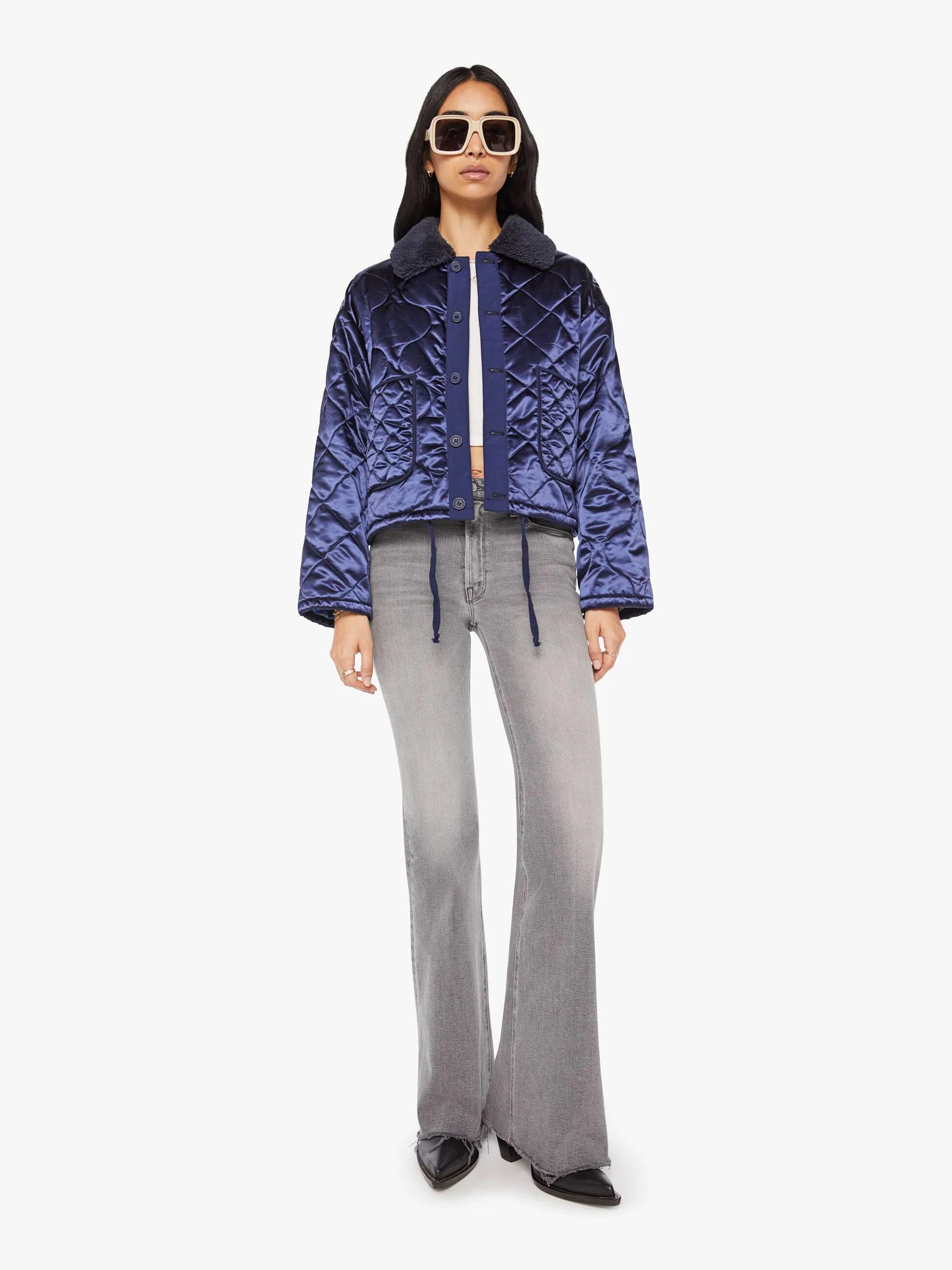 Home on the range. A quilted collared jacket with slightly dropped shoulders, buttons down the front, drawstring hems and a boxy fit. Made from quilted silky fabric in an iridescent dark blue, Cottage In The Country features a faux-sherpa collar and tonal buttons.