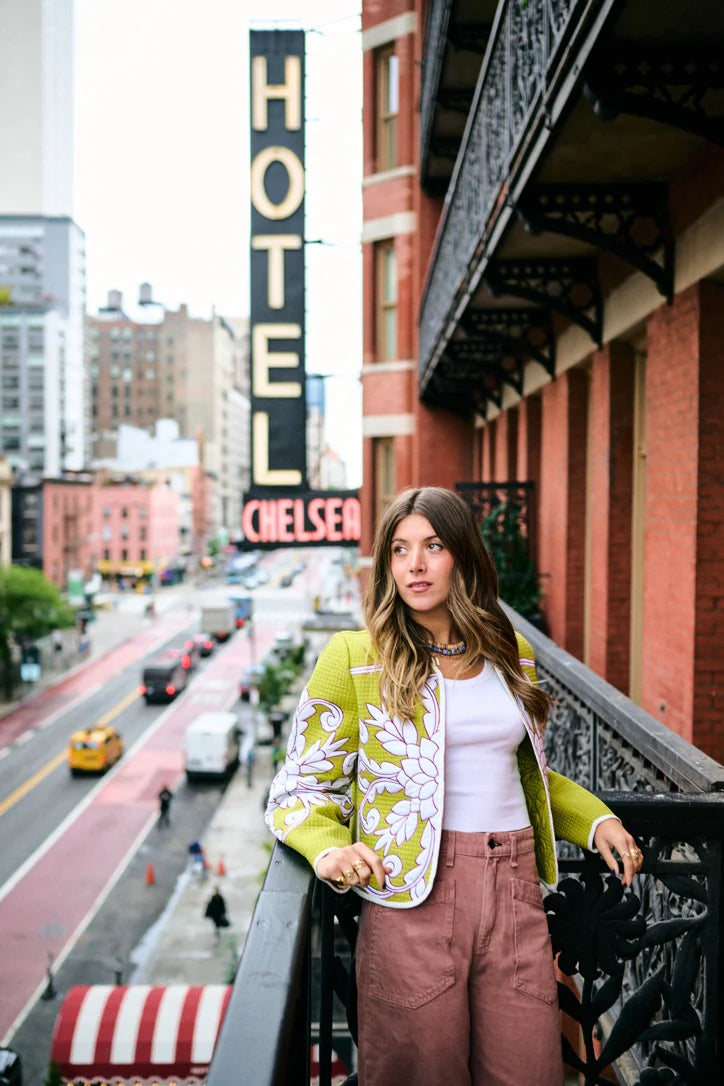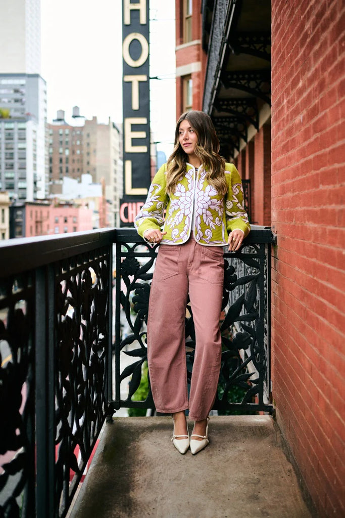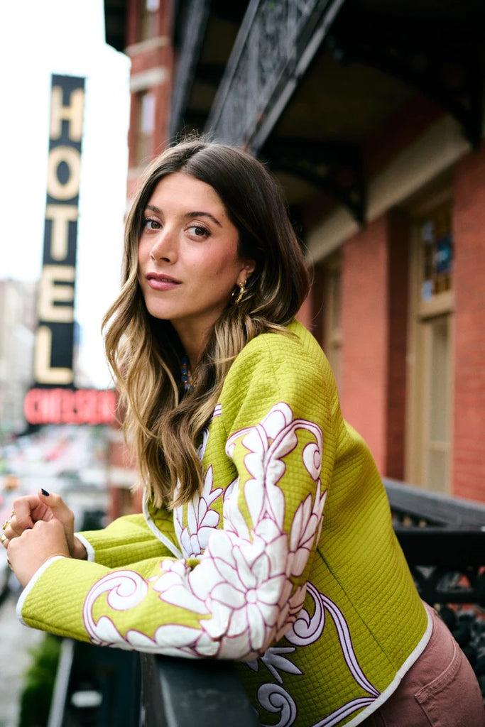 Our Park Quilted Mini Skirt is crafted from a quilted cotton in a vibrant olive-pear hue. A tile-inspired appliqué wraps around the hemline, making the skirt a standout all on its own as well as the perfect pair to its matching Mimi Quilted Jacket. Its clean A-line silhouette is both playful and polished, making it easy to dress up with a blouse as it is throw on with a tee and sneakers. Designed to be worn, loved, and styled year-round, this skirt carries the spirit of heirloom craftsmanship into modern day.