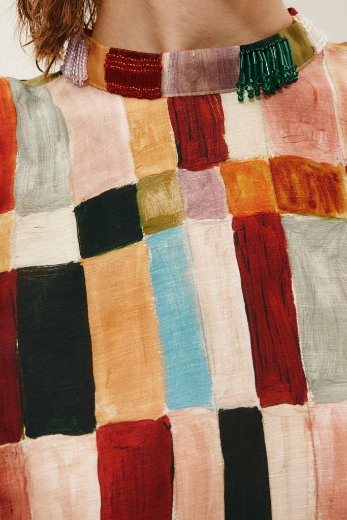 - Round neck with button and loop closure at centre back