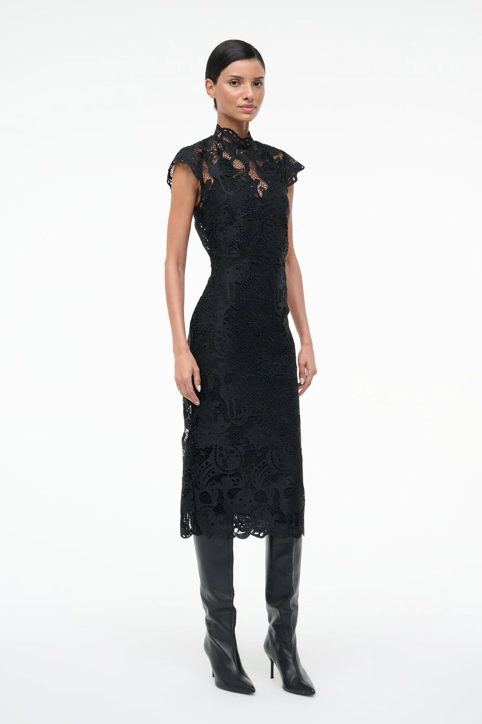 A fitted, mock neck dress crafted in guipure lace, the Rosaline features flutter sleeves and hits just below the knees for ease in pairing with boots or heels.