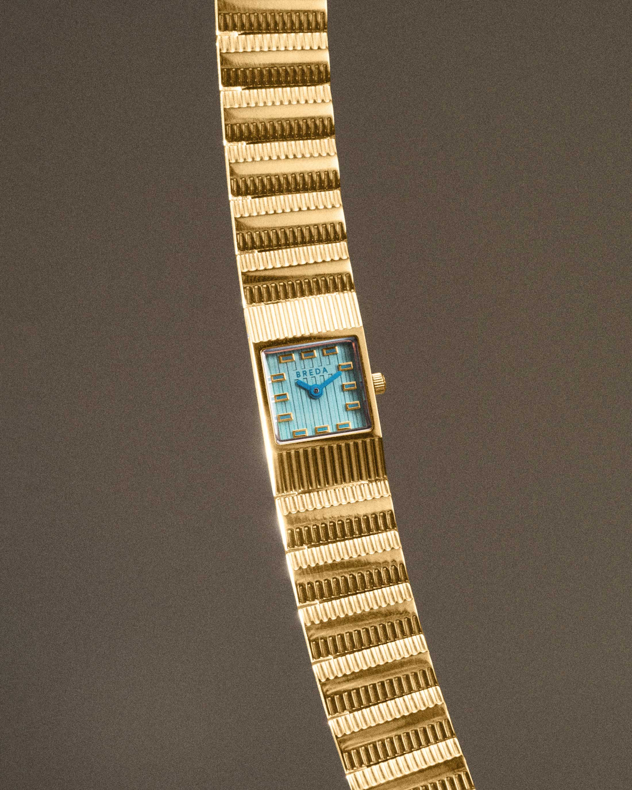 Groove carries a petite 16mm square case and a 16mm bracelet; this timepiece presents a delicate buckle feature and fastens with a jewelry clasp.