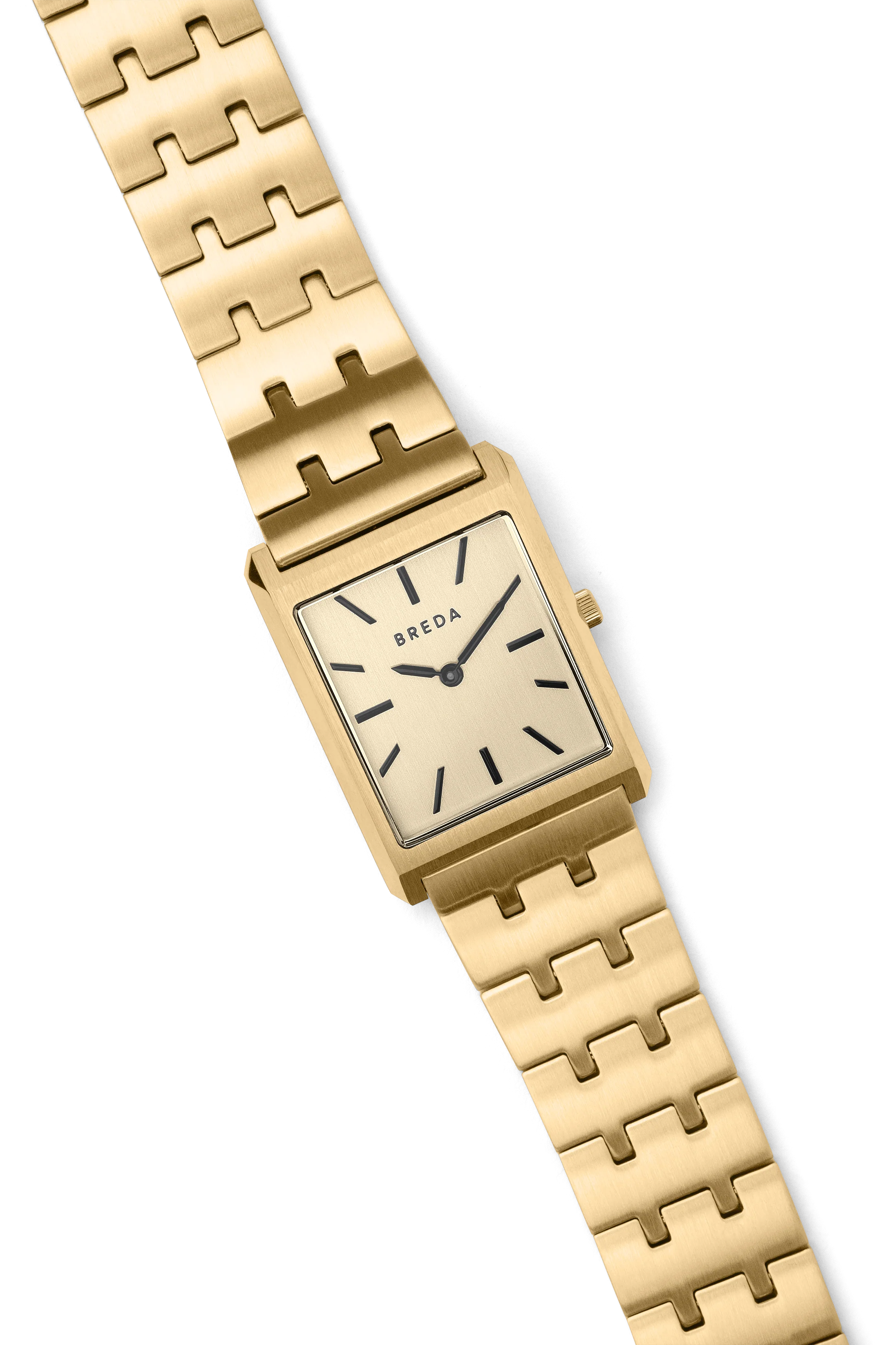 Well-appointed with sophisticated defining traits, the Virgil boasts a slim 26mm 18K gold-plated rectangle case that meets a tapered bracelet and fastens with a pusher clasp. With a midnight black brushed dial and refined sleek edges, the Virgil reflects the sentiment of a vintage timepiece.