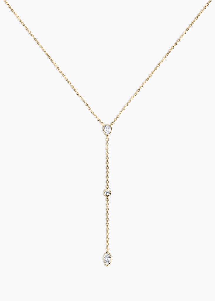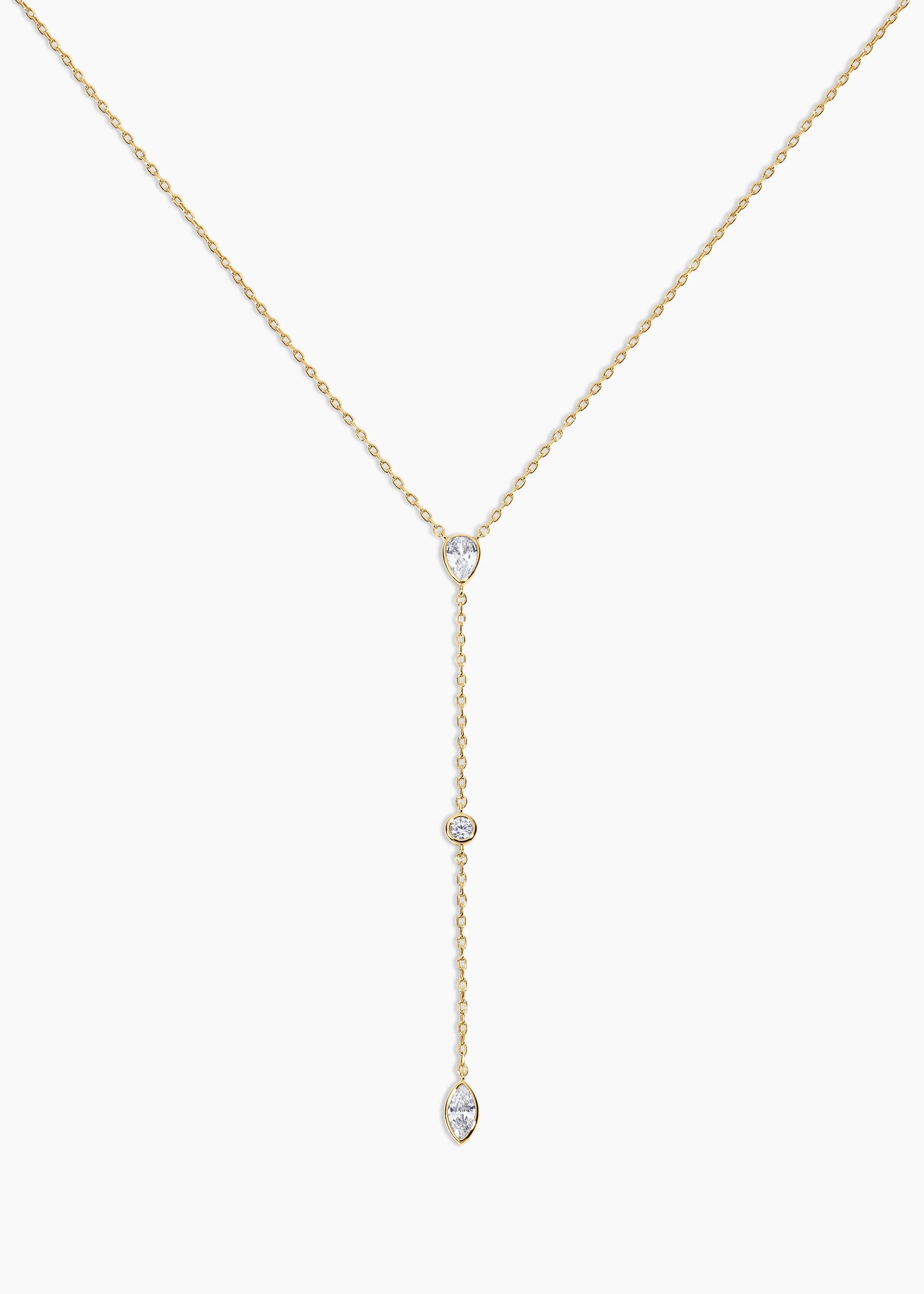 Classy and delicate, our Paloma Necklace is the perfect accessory for adding a delicate drop of elegance. This lariat necklace drapes gracefully featuring a trio of three sparking stones on a minimalist gold chain.