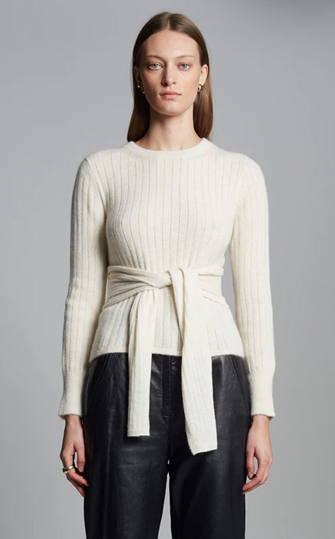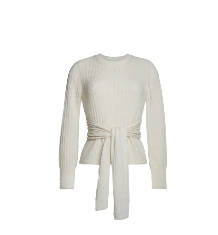 The Alaiya is a sweater that balances relaxed comfort with polished style. Crafted in a modern wide flat rib-stitch, it offers a slim fit with some ease. A built-in cumberbund-style back tie wraps to the front, subtly cinching the waist for a flattering, feminine silhouette. Versatile and effortlessly chic, Alaiya transitions seamlessly from day to night. The classic ivory—a timeless neutral—makes this dressy sweater staple you'll reach for again and again.