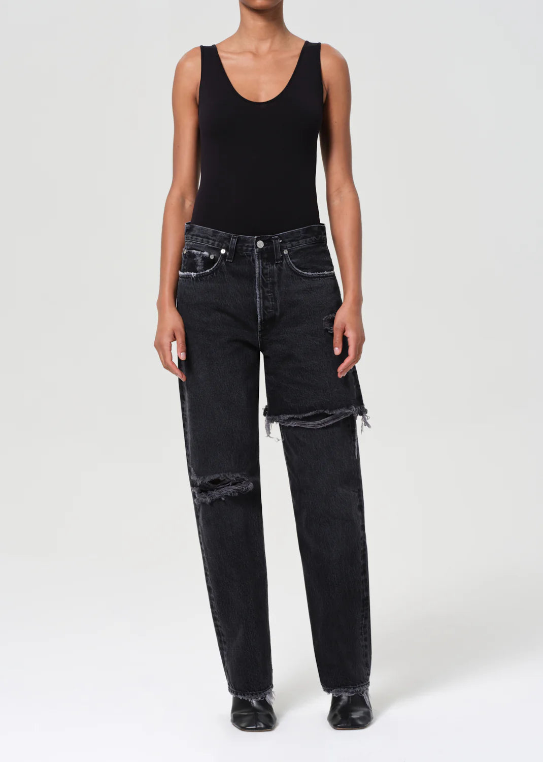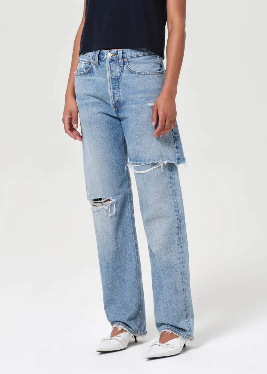 This authentic medium indigo jean features reworked destruction details for a raw, lived-in edge. Crafted from rigid regenerative cotton with a soft hand, the high-rise straight fit offers all-day comfort and a true-to-size silhouette. Style with a relaxed tee for an effortlessly cool look.