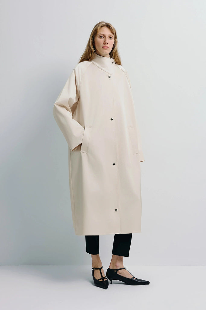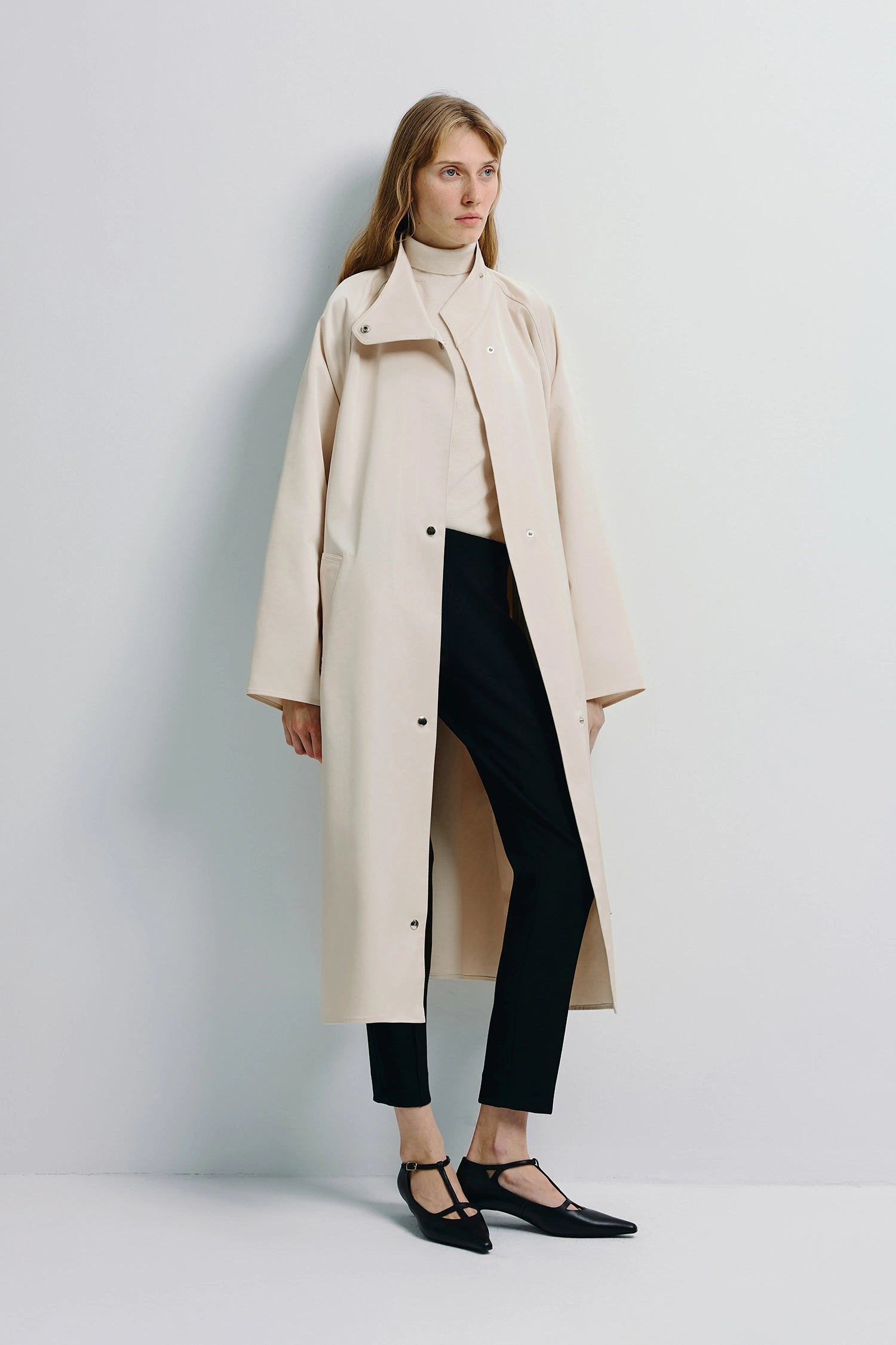 This unlined coat features a subtle satin sheen and straight silhouette. Lightweight with a softly structured finish for transitional layering.