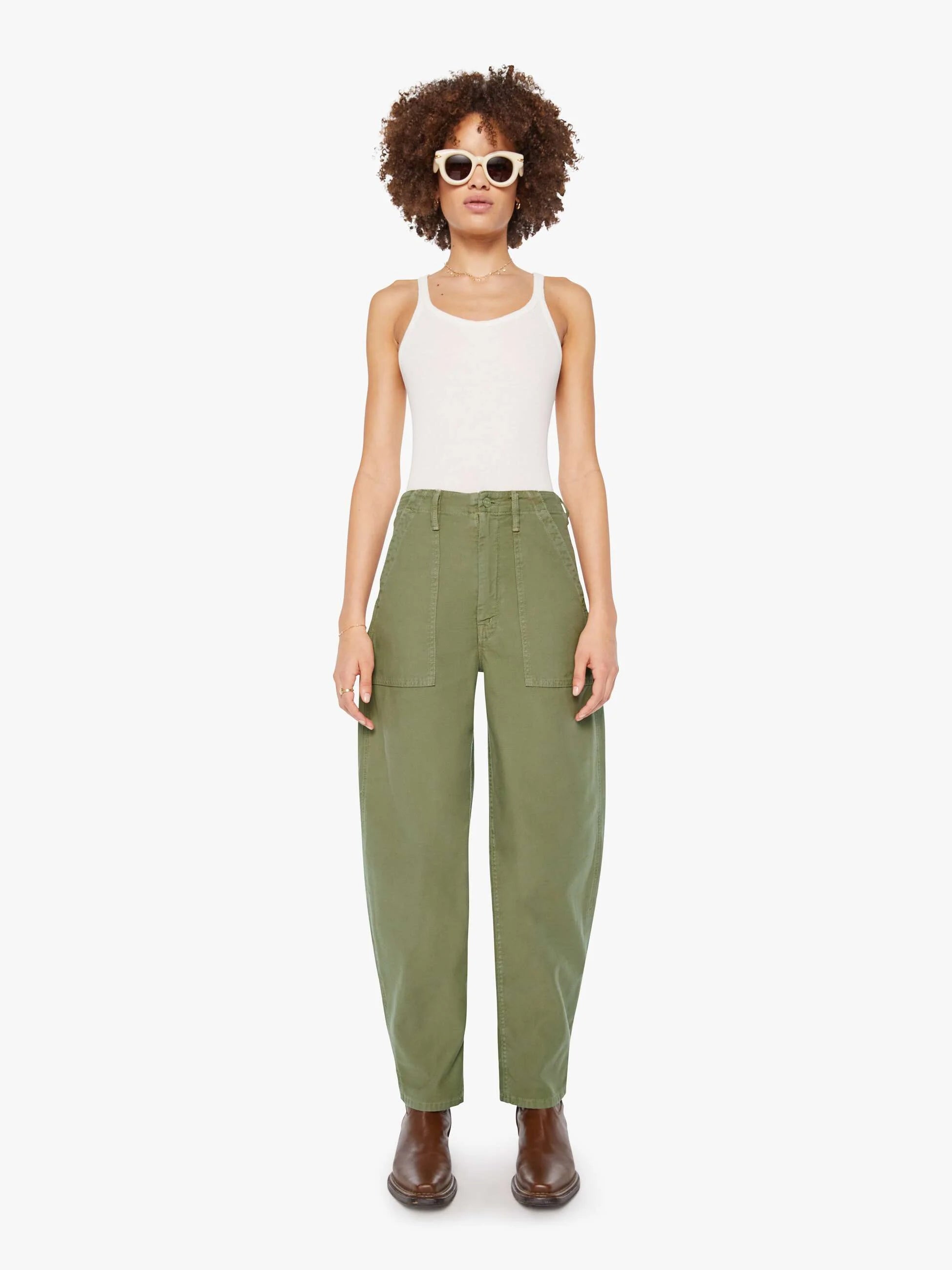 At ease. High-waisted pants with a wide barrel leg, zip fly, oversized patch pockets and a 28.25-inch inseam with a clean hem. Made from rigid 100% cotton, Sir, Yes Sir is a faded army green with tonal hardware.