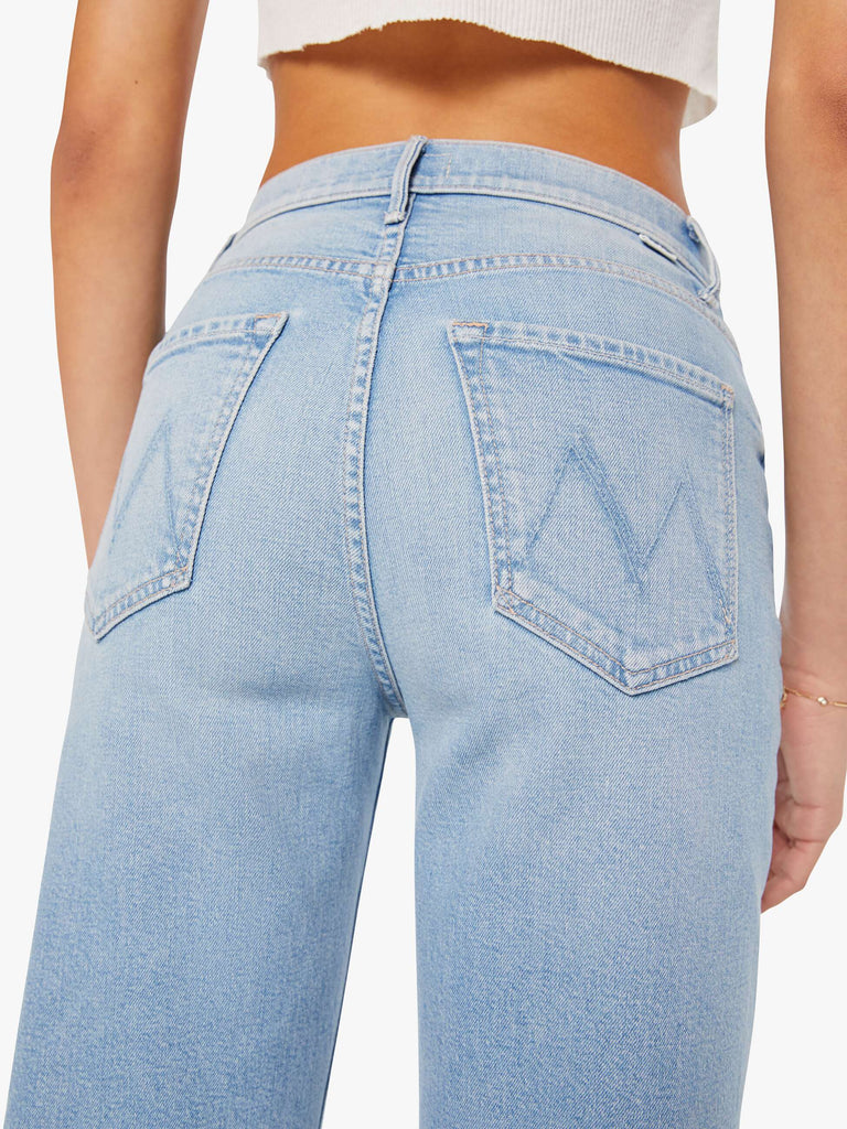 Trail blazer. Super high-rise jeans with a loose fit, wide leg, zip fly and 32-inch inseam with a clean hem. Cut from denim with a touch of stretch, All Fired Up is light blue with whiskering and fading at the knees.