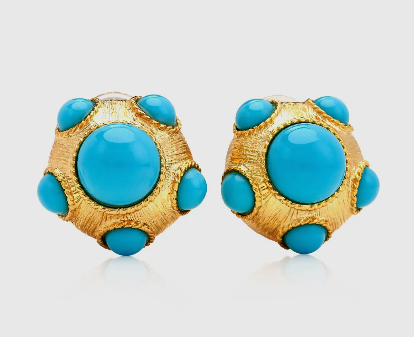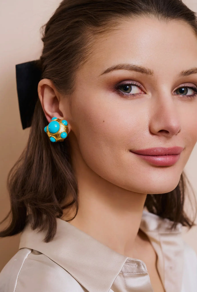 These gold-plated button clip-on earrings feature turquoise cabochons with a turquoise center, offering a vibrant and stylish design.