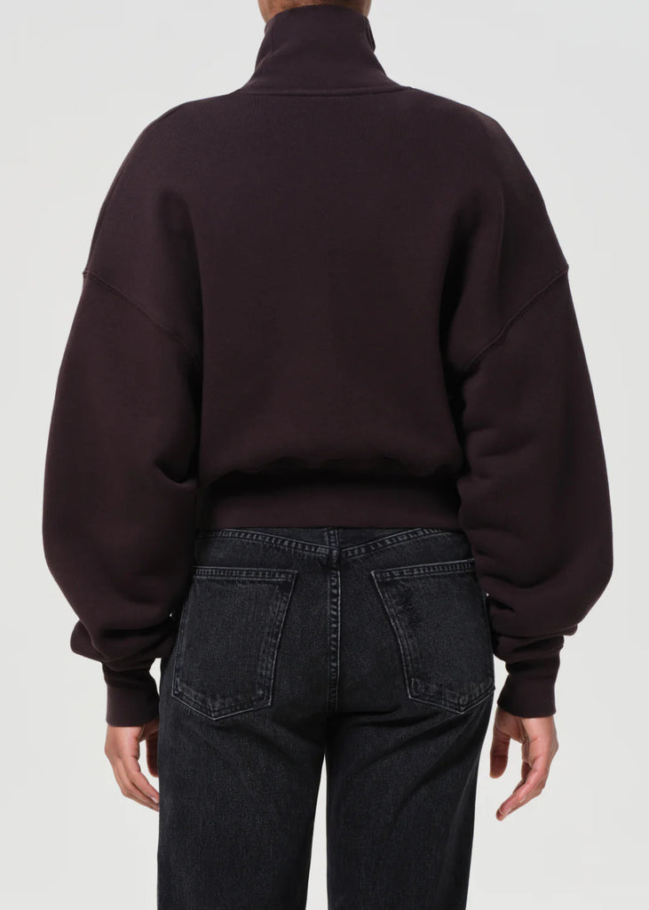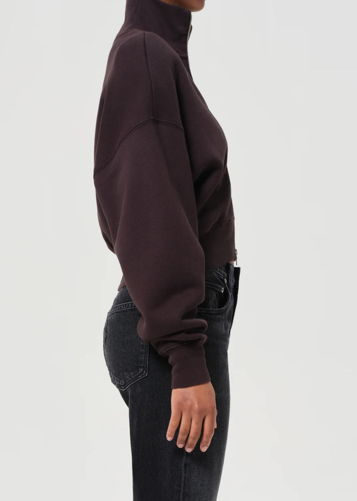 The Darby Zip Up is a high-collared sweatshirt with a cropped, boxy fit and exaggerated ribbed hem. Crafted from breathable, soft cotton fleece with just the right amount of drape, it’s finished in a deep chocolate brown for a sleek tonal look. Style with high-rise denim or layered under a structured coat for modern contrast.
