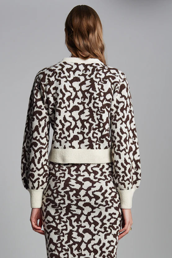 Rumi is a patterned cardigan inspired by the artwork of Caroline Burdett, translating her bold graphics into a timeless two-color design using a double-bed jacquard stitch. Crafted from the softest Peruvian alpaca yarn, this cardigan features feminine blouson sleeves and a cropped silhouette finished with Italian horn-effect buttons. Whether worn buttoned up as a standalone piece or layered over your favorite high-waisted bottom, Rumi offers versatile, elevated style.