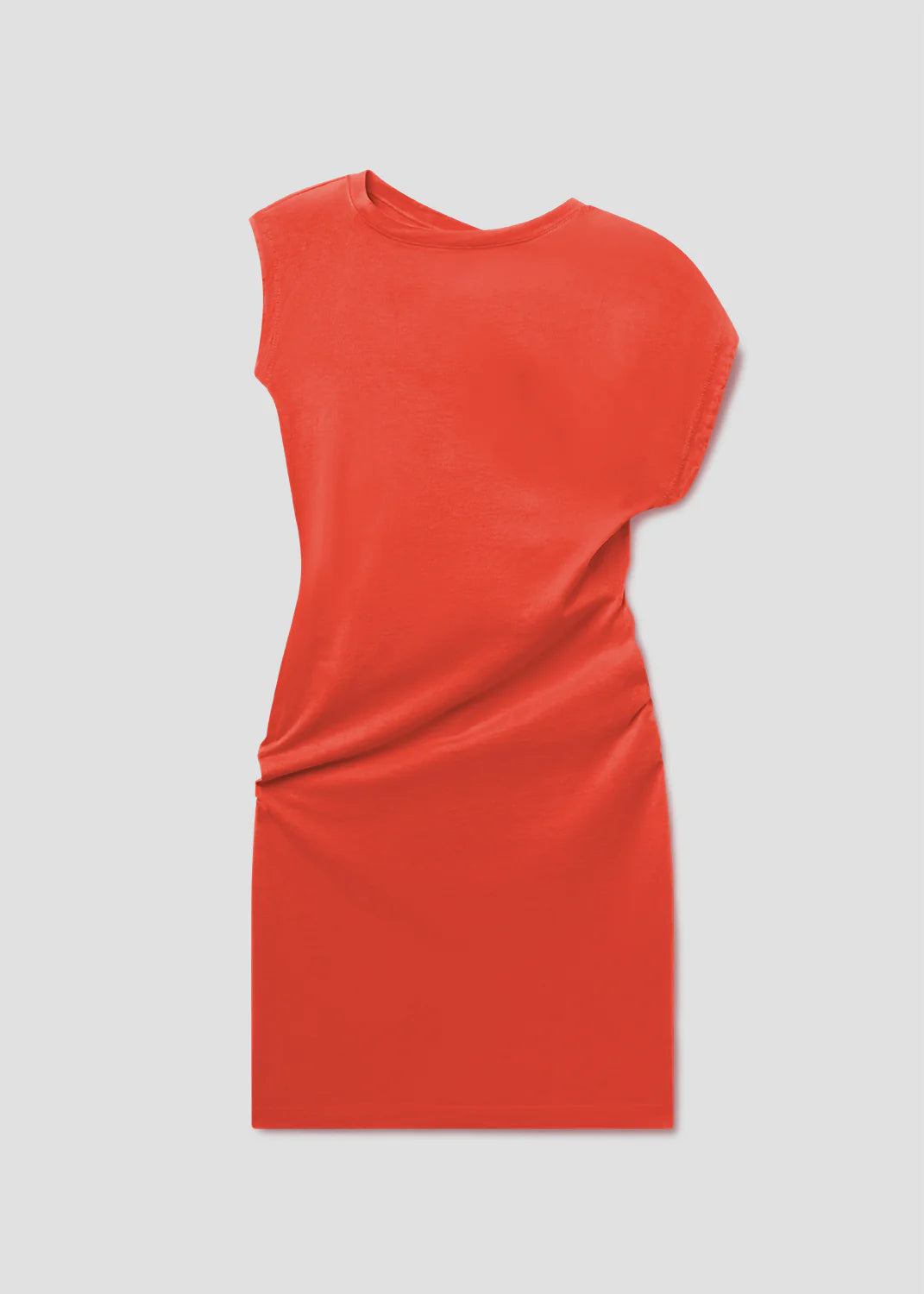 The Beth Dress brings bold energy to a streamlined silhouette. Designed in a medium bright red hue with subtle orange undertones, it features an asymmetrical neckline and cap sleeves that create soft, sculptural balance. Crafted from lightweight super soft jersey cotton, it moves effortlessly with the body while maintaining a polished, flattering shape.