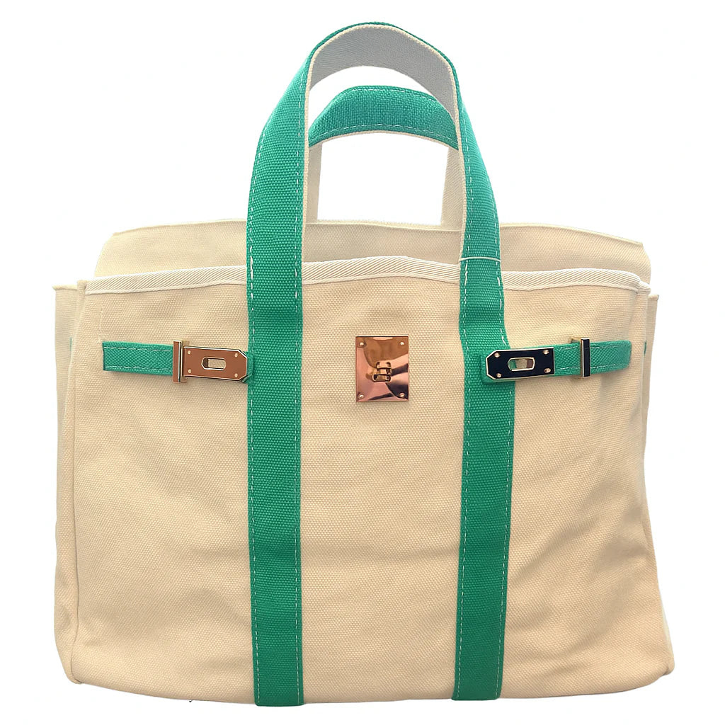 Secure & Simple Closure: Top flap with sturdy gold finished hardware to easily keep your belongings securely in place, creating a sleek, minimalist silhouette with green canvas straps.