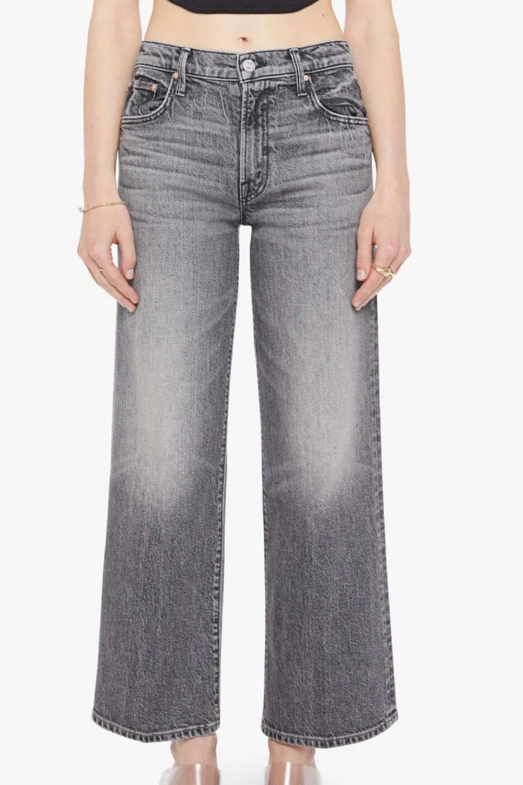 Birds of a feather. Mid-rise jeans with a loose fit, wide leg, zip fly and ankle-length inseam with a clean hem. Made from semi-rigid SUPERIOR denim, Magpie is a dark grey with whiskering and fading at the knees.