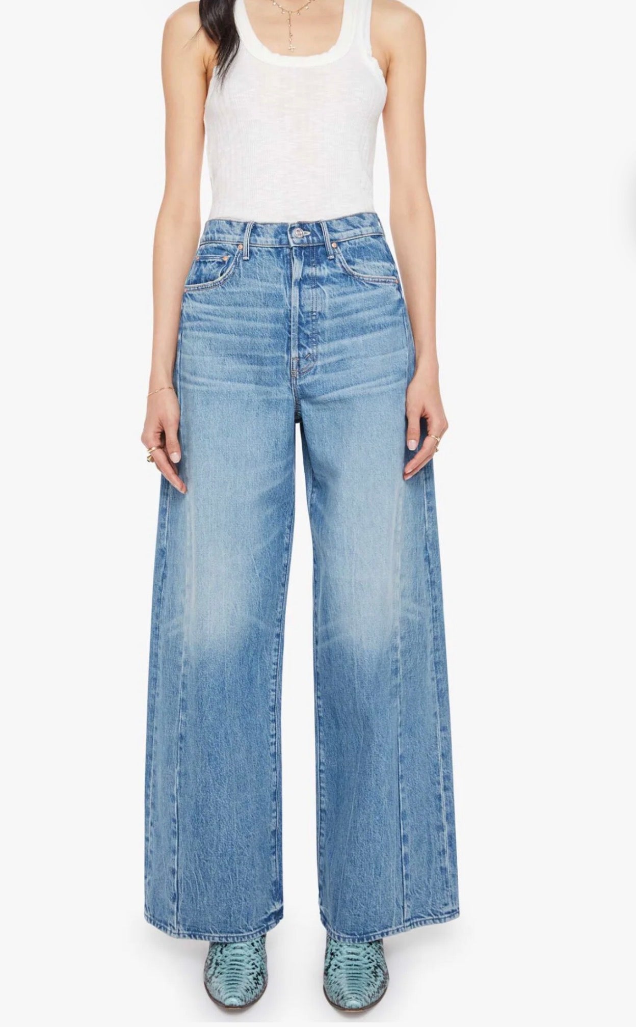 Star of the show. Super high-waisted barrel-leg jeans with a long 32-inch inseam, a button fly, inset panels on the outer seams, a clean hem and relaxed fit. Made from rigid SUPERIOR denim, Folk Star is a mid-blue with whiskering and fading at the knees.