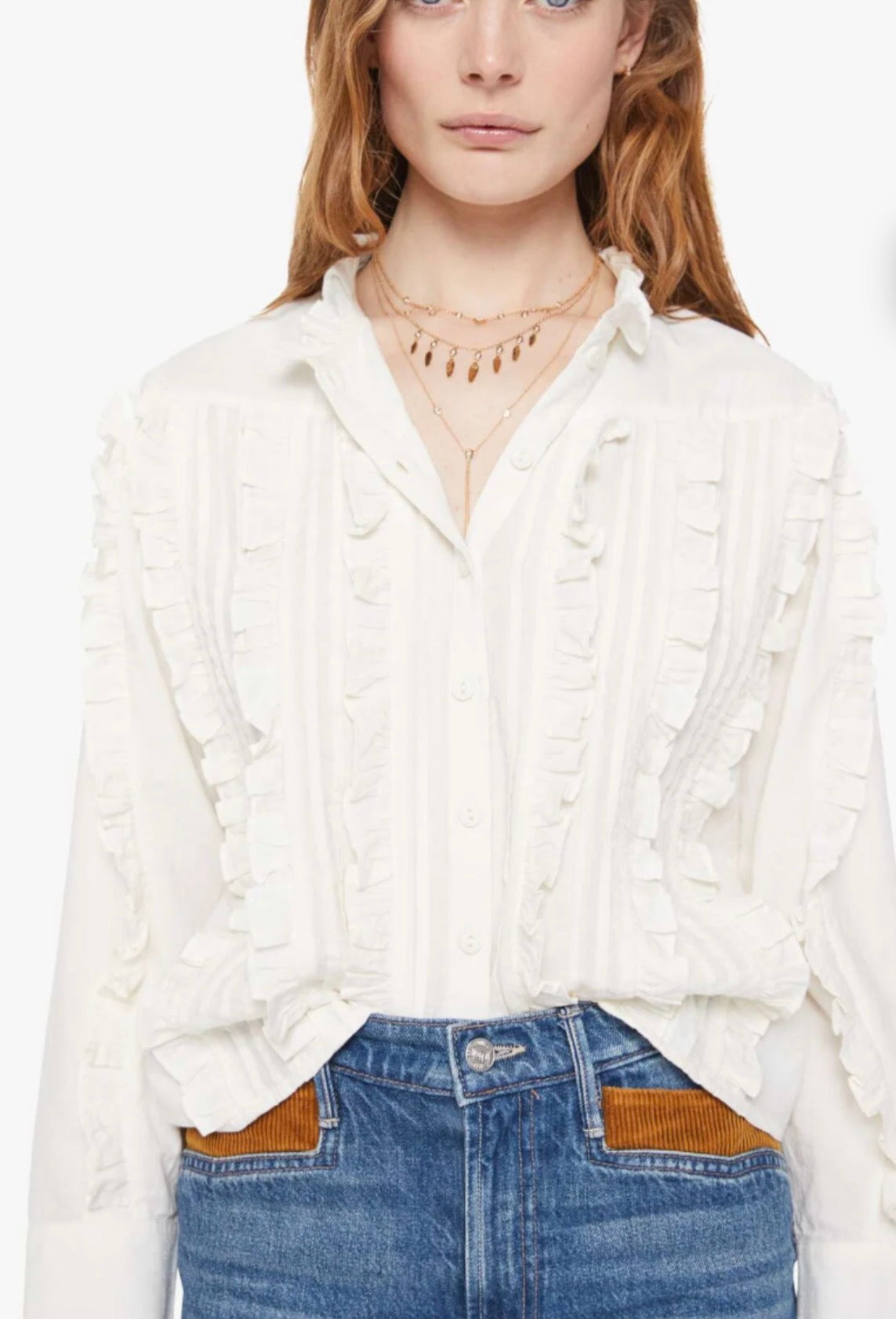 A button-up blouse with long sleeves, slightly dropped shoulders and a boxy fit. Made from 100% cotton in off-white, the blouse is designed with ruffled details throughout.